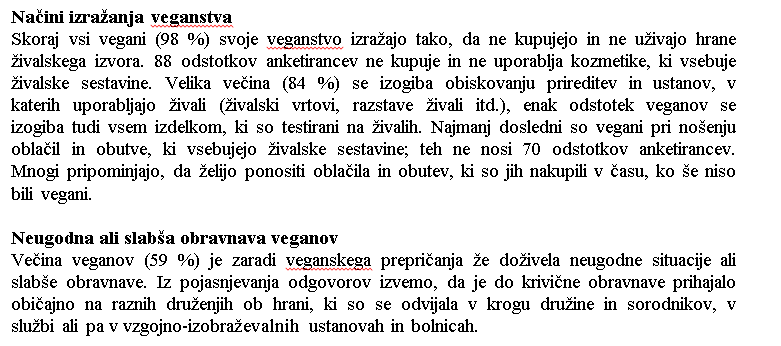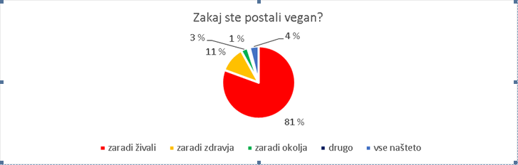 V raziskavi je sodelovalo 300 veganov z vseh koncev Slovenije. Največ jih je bilo iz osrednjeslovenske regije in z Gorenjske (42 %), 29 odstotkov iz Savinjske, Koroške, Podravske in Pomurske regije, 9 odstotkov z Dolenjske in iz Bele krajine in 7 odstotkov iz jugozahodnega dela Slovenije. Večina anketirancev (72 %) je bila ženskega spola, četrtina moškega, ostali pa tega podatka niso navedli. Med anketiranci je bilo 65 odstotkov zaposlenih, 17 odstotkov šolajočih, 12 odstotkov brezposelnih in 6 odstotkov upokojencev. 57 odstotkov anketiranih (172 oseb) je odgovorilo, da so vegani manj kot deset let, 12 odstotkov deset ali več let, ostali pa na to vprašanje niso odgovorili (31 %). Anketiranci so večinoma postali vegani zaradi živali (81 %), nekateri pa tudi zaradi zdravja, okolja in iz drugih razlogov, kar prikazuje spodnji grafikon.