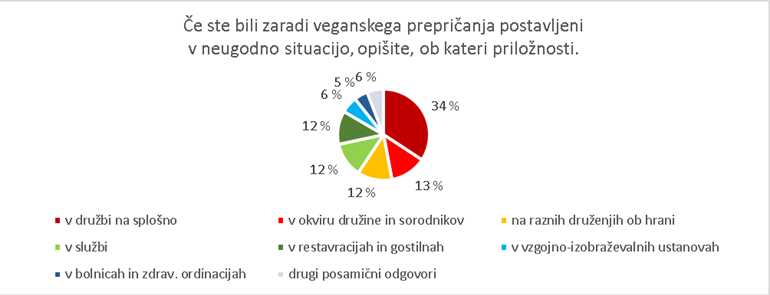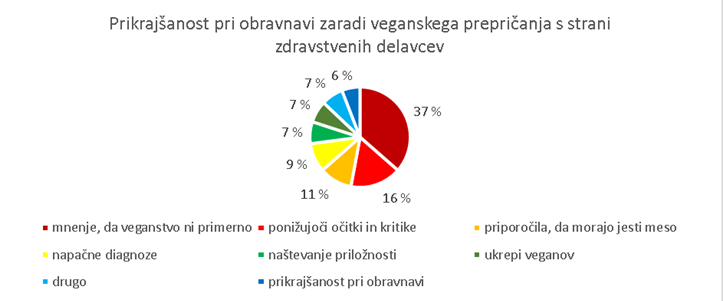 Več kot četrtina veganov (29 %) je že bila izpostavljena neprimernim komentarjem ali neustrezni obravnavi s strani zdravstvenih delavcev. Opise dogodkov, pri katerih so bili zaradi svojega veganskega prepričanja prikrajšani v zdravstvenih ustanovah, prikazuje spodnji grafikon. Nekaj anketirancev (7 %) je v odgovoru le naštelo priložnosti, ob katerih so bili diskriminirani zaradi veganskega prepričanja, 7 odstotkov veganov pa je navedlo svoje ukrepanje; nekateri vztrajno dokazujejo, da veganstvo dobro vpliva na njihovo zdravje, drugi zamenjajo zdravnika, tretji pa zatajijo svoje veganstvo.