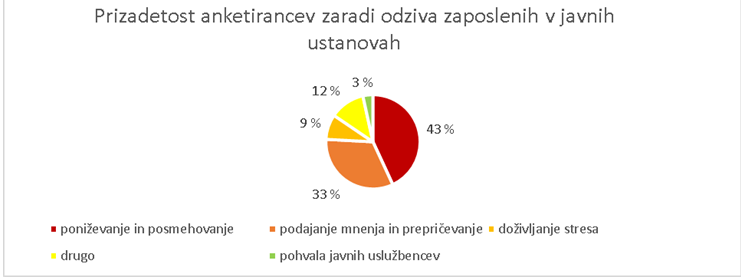 Tretjino veganov (33 %) so komentarji, ki so jih dajali zaposleni v javnih ustanovah ob omembi veganstva, prizadeli. Njihove opise dogodkov lahko razdelimo v več skupin, kar prikazuje spodnji grafikon. Samo dva vegana (0,7 %) sta pohvalila odziv javnih uslužbencev (eden je pohvalil osebno zdravnico, ena anketiranka pa omogočanje veganske prehrane v porodnišnici v Novem mestu).
