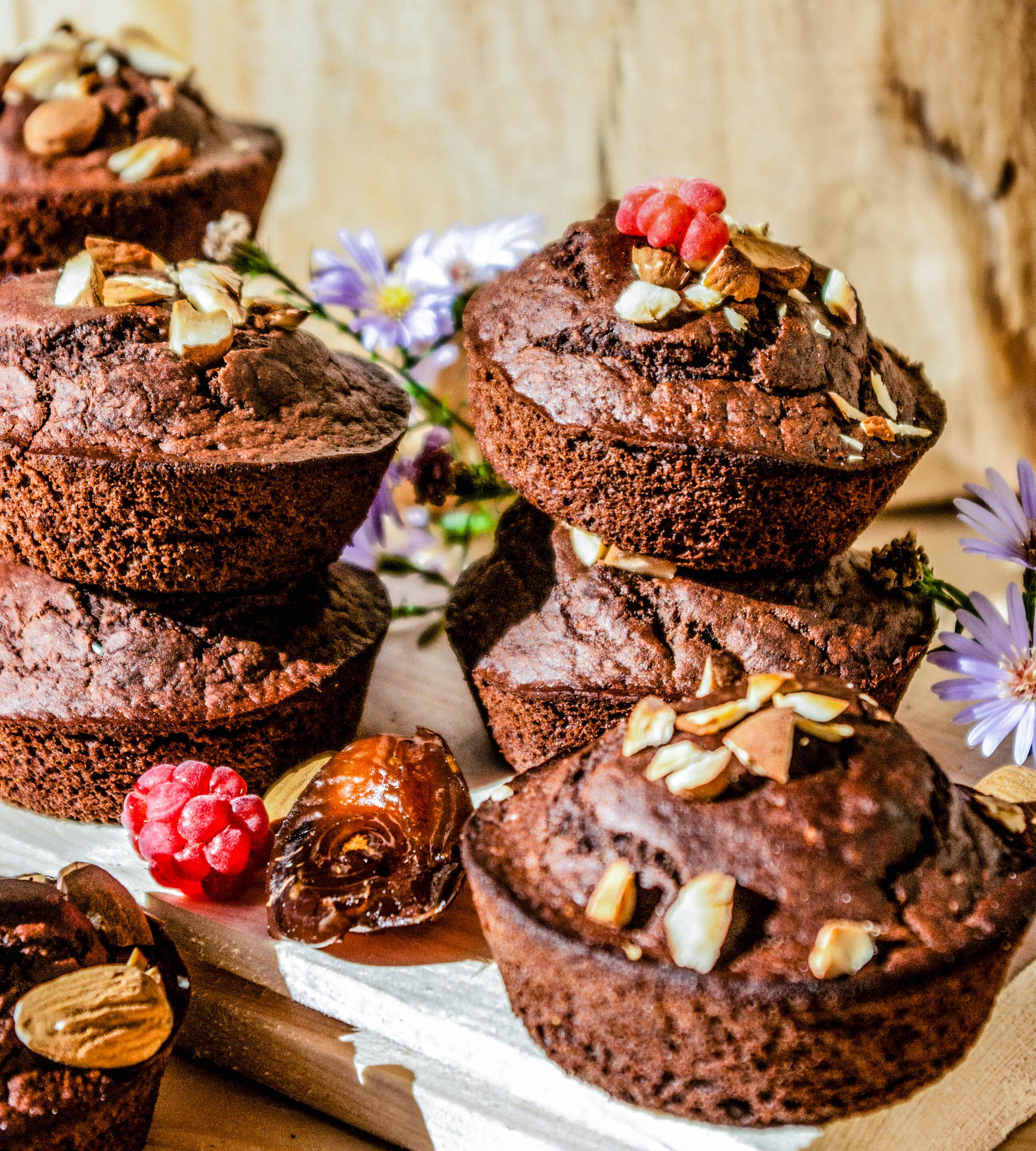 Po 10 minutah peke, na mafine nadevamo še nasekljane mandlje in pečemo še preostanek časa. Postrežemo ohlajene.